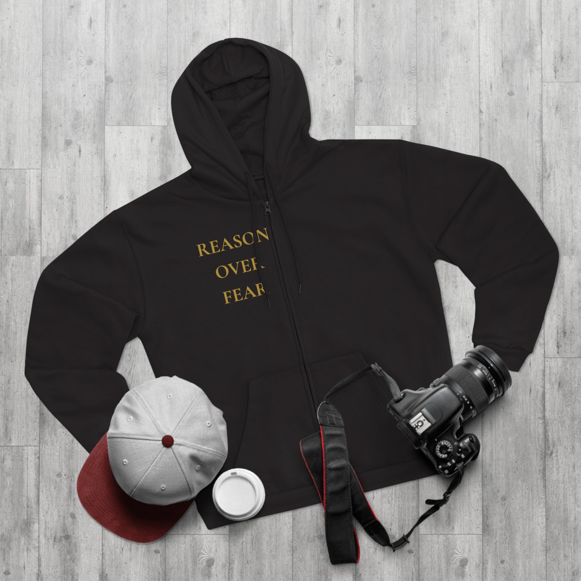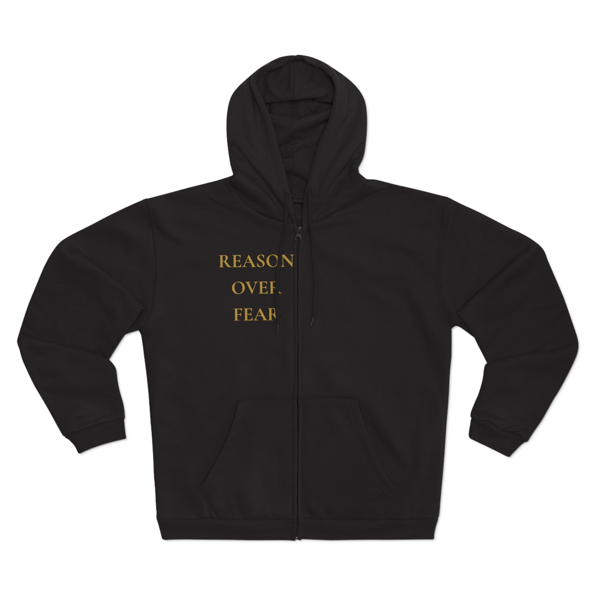 This zip-up hoodie speaks softly but firmly: REASON OVER FEAR. The heavy brushed fleece and structured side seams give it a comforting weight — like armor for anxious days and a reliable layer for late-night walks, loud rallies, or focused study sessions. The text, rendered in muted gold against deep black, reads like a quiet reminder on your chest and a bolder statement across your back. Pull the hood up, tighten the self-colored drawcord, slip your hands into the spacious kangaroo pocket, and move through the world with clearer thinking and steadier breath. It wears like someone who values thoughtfulness and courage over impulse. Whether you’re heading to a debate, a long shift, or a meet-up with friends who think deeply, this hoodie settles you into presence and purpose.